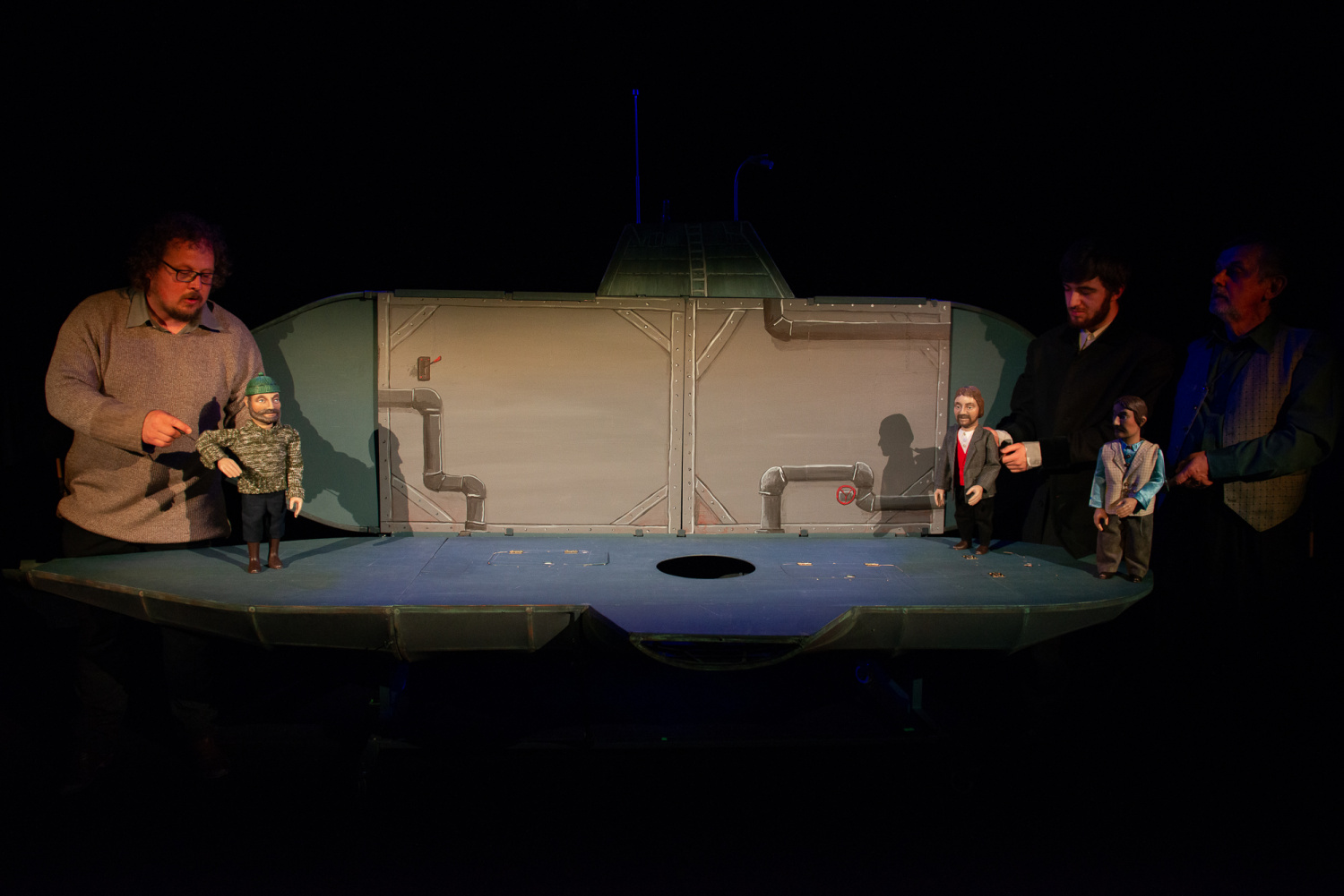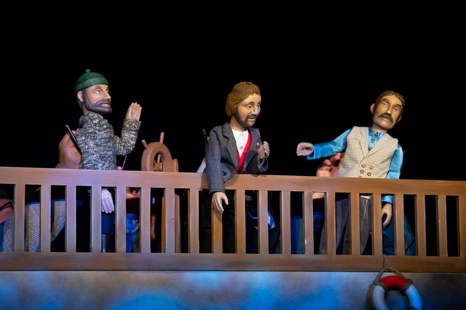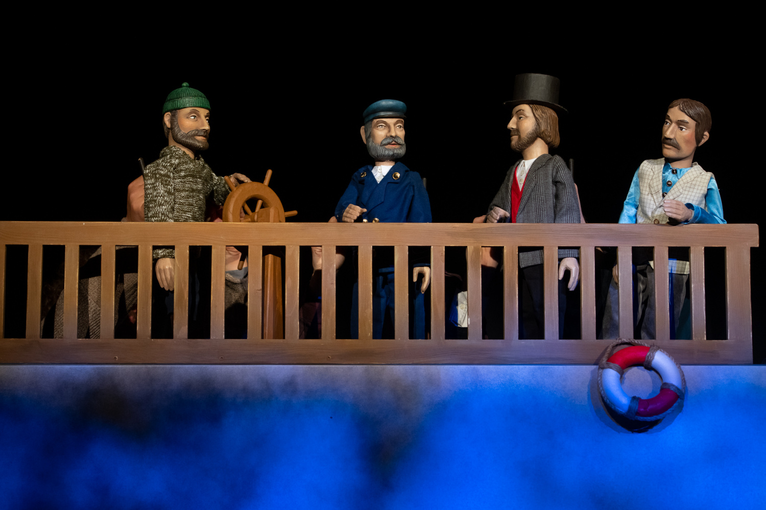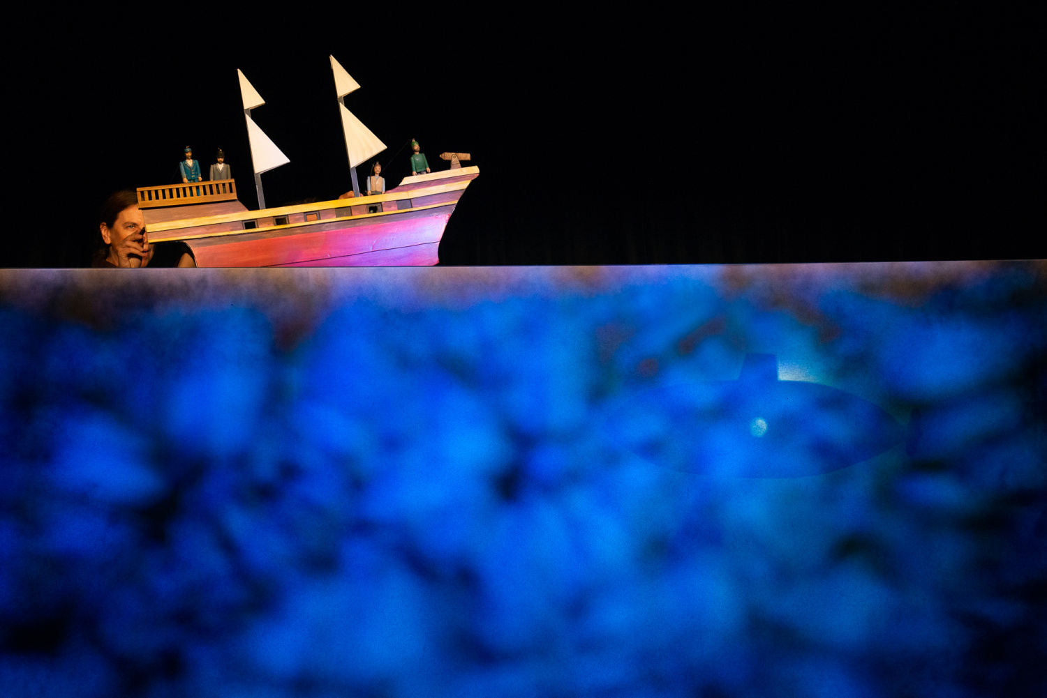 Když však přijde i se svým sluhou k velké lodi, nastupuje sice herec v životní velikosti, ale na palubě se již objeví loutky profesora i sluhy ve stejném oblečení. Následuje loutková scéna střetu s lodi s domnělou obrovskou mořskou příšerou, loď je potopena, ale již v průběhu konfliktu diváci vidí, že ji potopila ponorka.