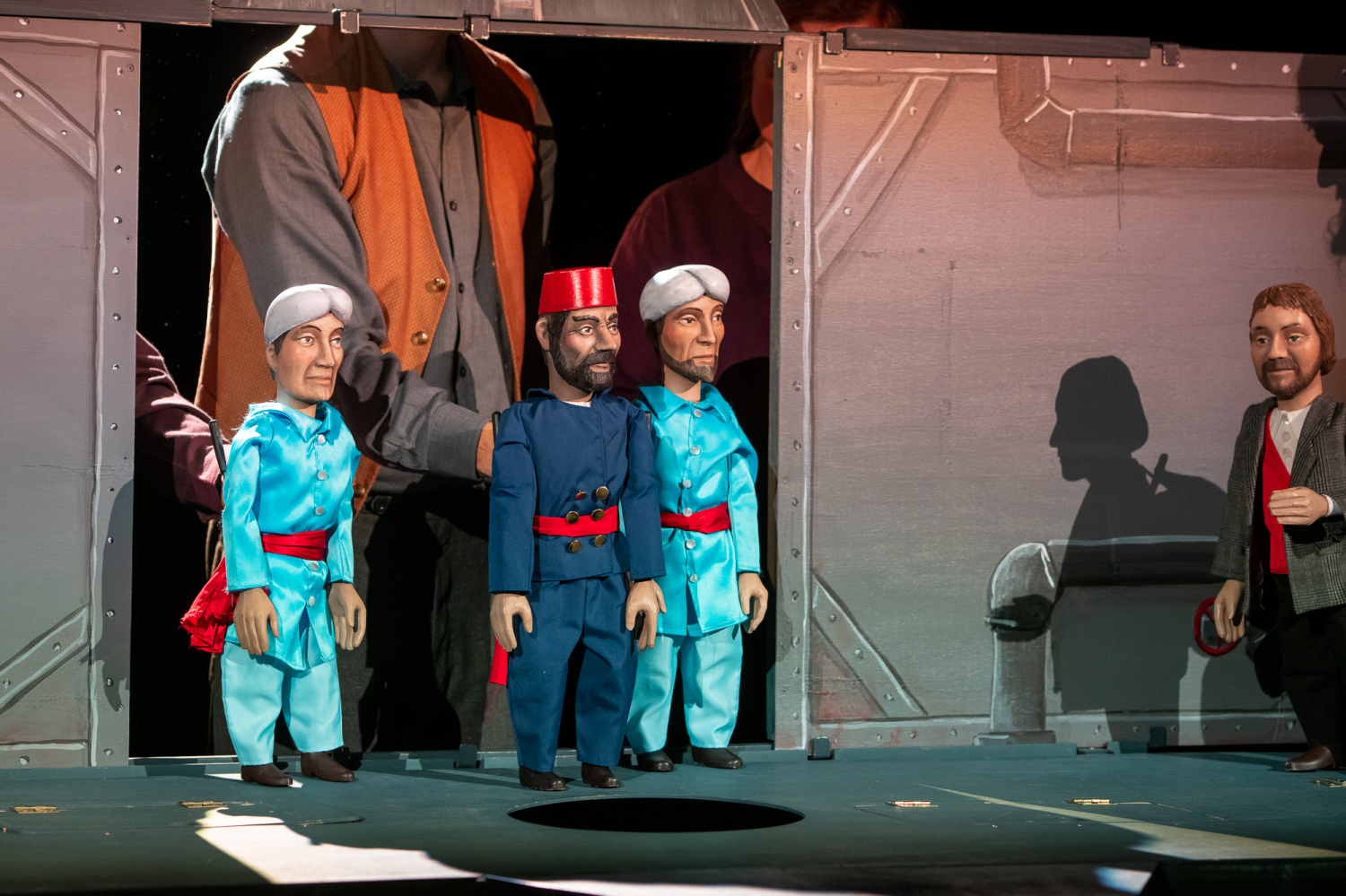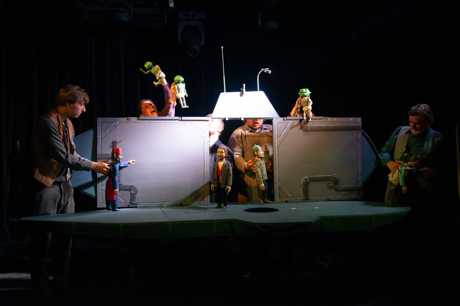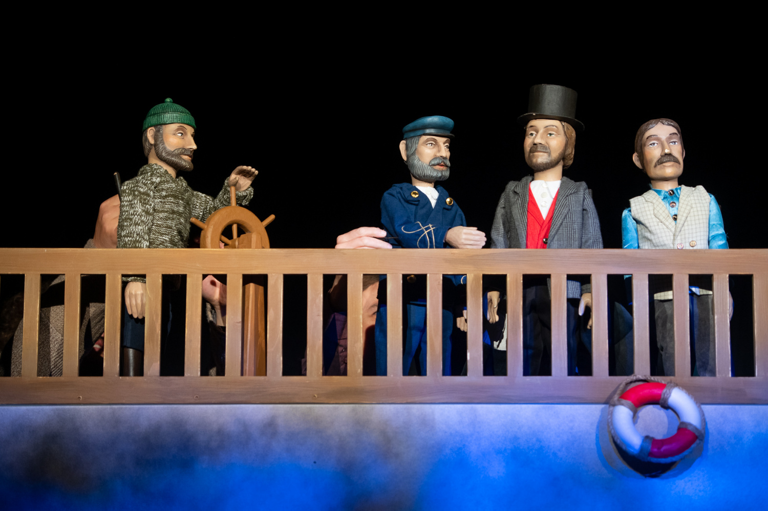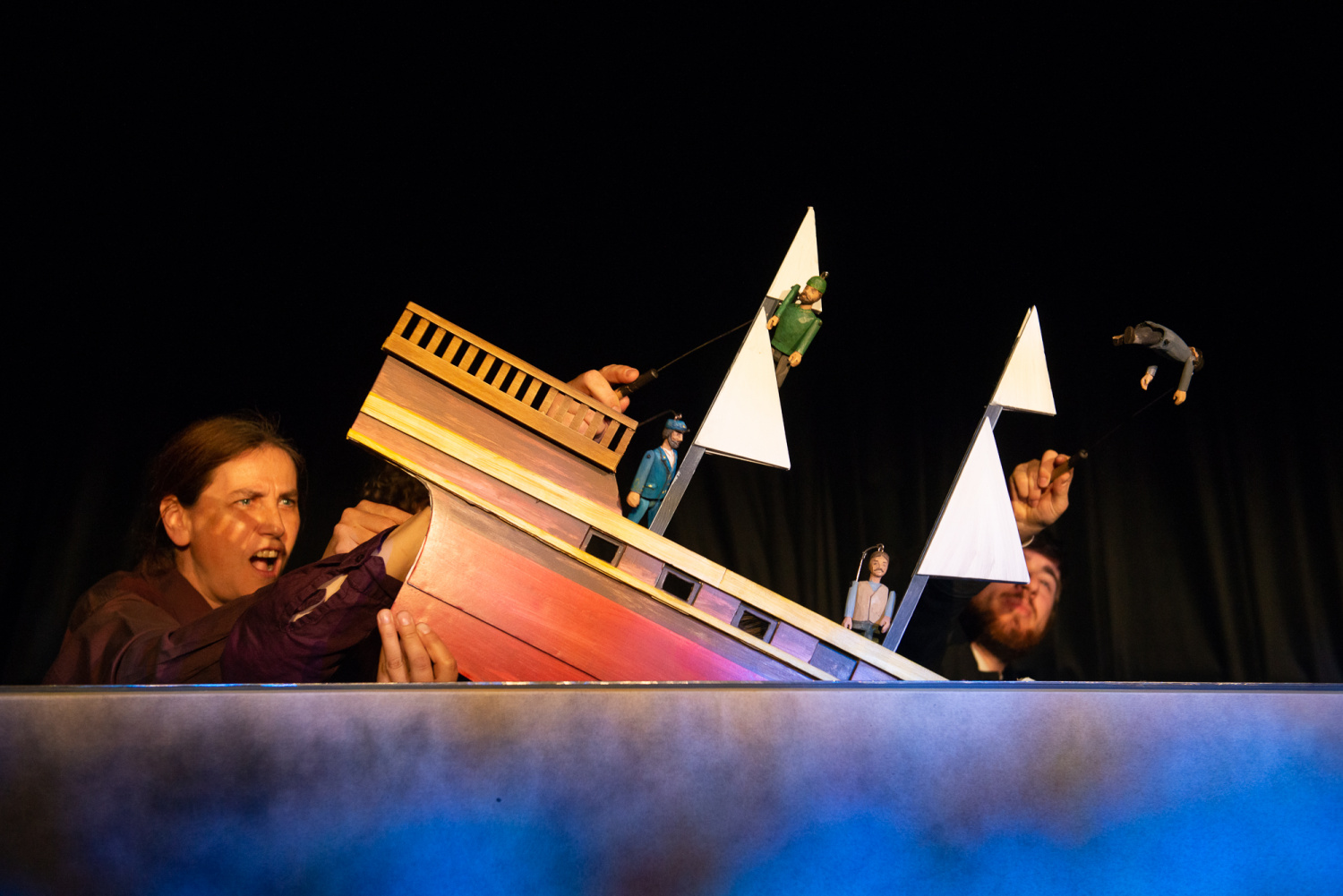 Když však přijde i se svým sluhou k velké lodi, nastupuje sice herec v životní velikosti, ale na palubě se již objeví loutky profesora i sluhy ve stejném oblečení. Následuje loutková scéna střetu s lodi s domnělou obrovskou mořskou příšerou, loď je potopena, ale již v průběhu konfliktu diváci vidí, že ji potopila ponorka.