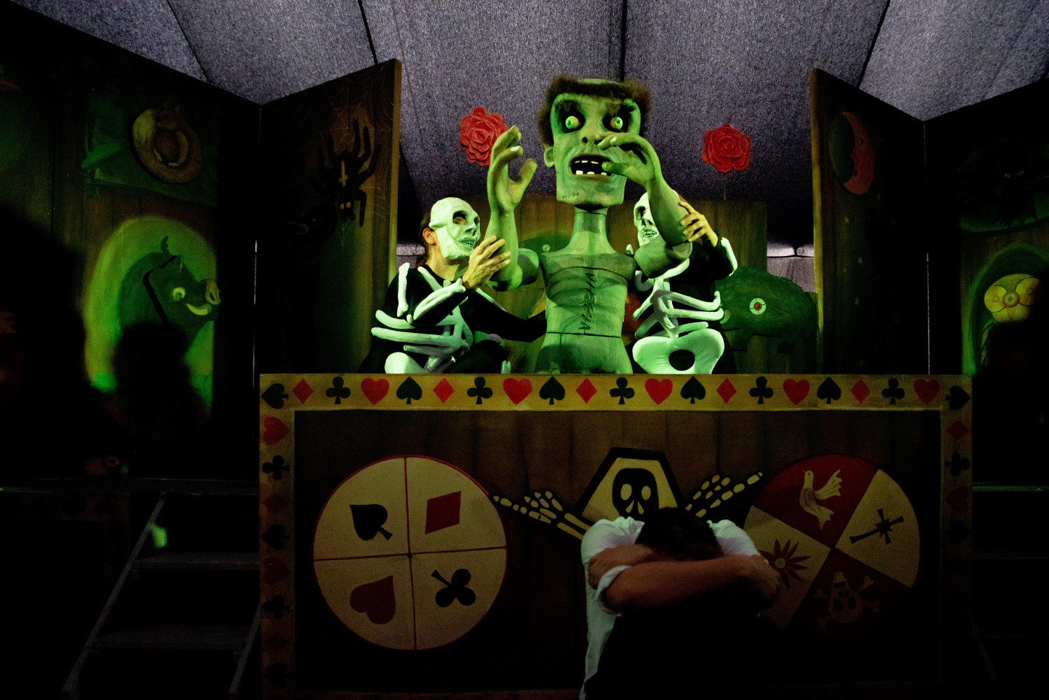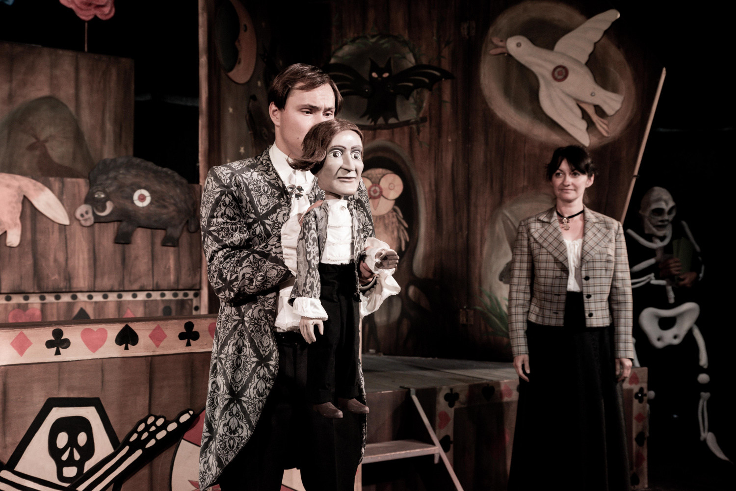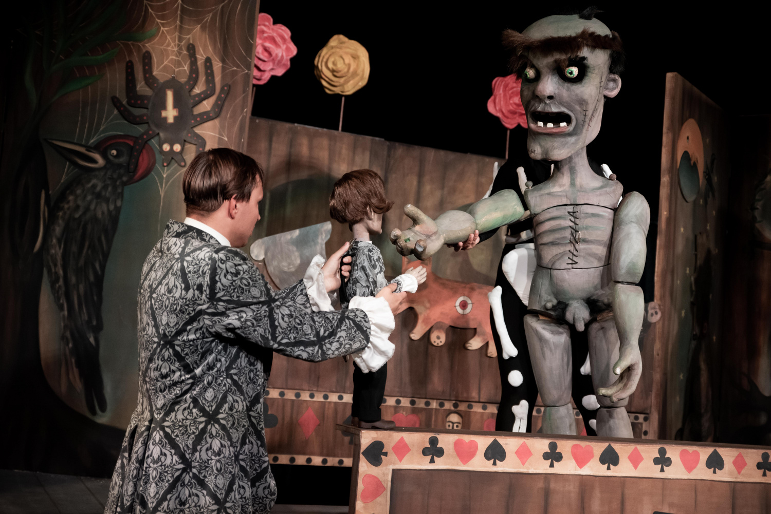 v příběhu plní průvodce a vševědoucí vypravěčky. Právě v jejích výstupech se nejčastěji objevují zamyšlení se nad tím, co znamená láska, jak se ukazuje, a jak bolí ztráta milovaného člověka. Své repliky pronáší bez zbytečného patosu a naopak jim dodává spíše naléhavý tón. Stejně jako ona proplouvají dějem i tři kostlivci (Ewa Kus, Jan Szymanik, Wanda Michałek), jejichž symbolický počet trochu připomíná čarovné tři sudičky. Do jisté míry fungují jako komický prvek, ale jejich karbaničení je spíše tíživou metaforou osudu – komu padne jaká karta? A jaká karta vlastně padla Viktoru Frankensteinovi, kterého skvěle ztvárnil Marek Moravec? Budoucí vědec vyrůstá zdá se obklopen milujícími rodiči (Dorota Grycz, Jakub Tomoszek) a přáteli, kteří ho podporují v jeho studiu. Je proto celkem pochopitelné, že po smrti matky upadá do hlubokého smutku a začíná hledat způsob, jak vrátit mrtvým život, následkem čehož se rodí Frankensteinovo monstrum. Viktorova urputnost získat ztracené ho však odtrhne od živých a to způsobem, že když skutečně zemřou, není to poprvé, kdy o ně přišel. Není však jasné, zda skutečně chápe, co je to láska, vždyť není schopen ji věnovat ani vlastnímu stvoření, jež přitom touží po jediném – po člověku, který ho bude mít rád.