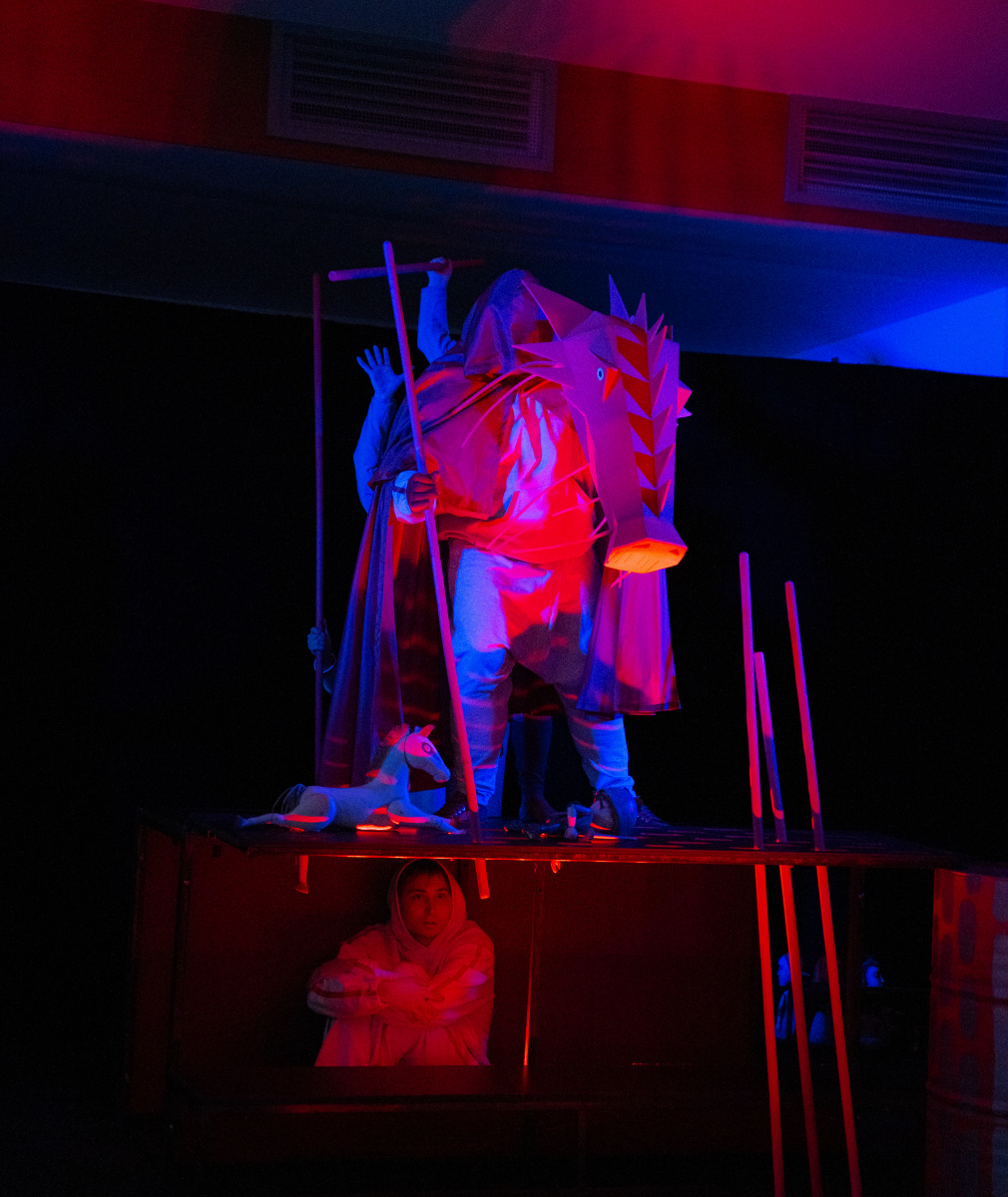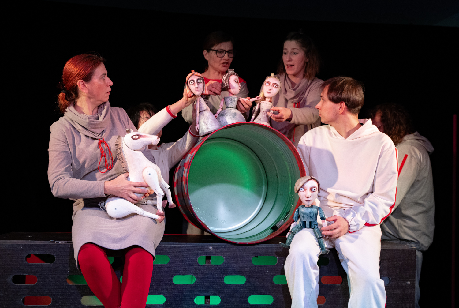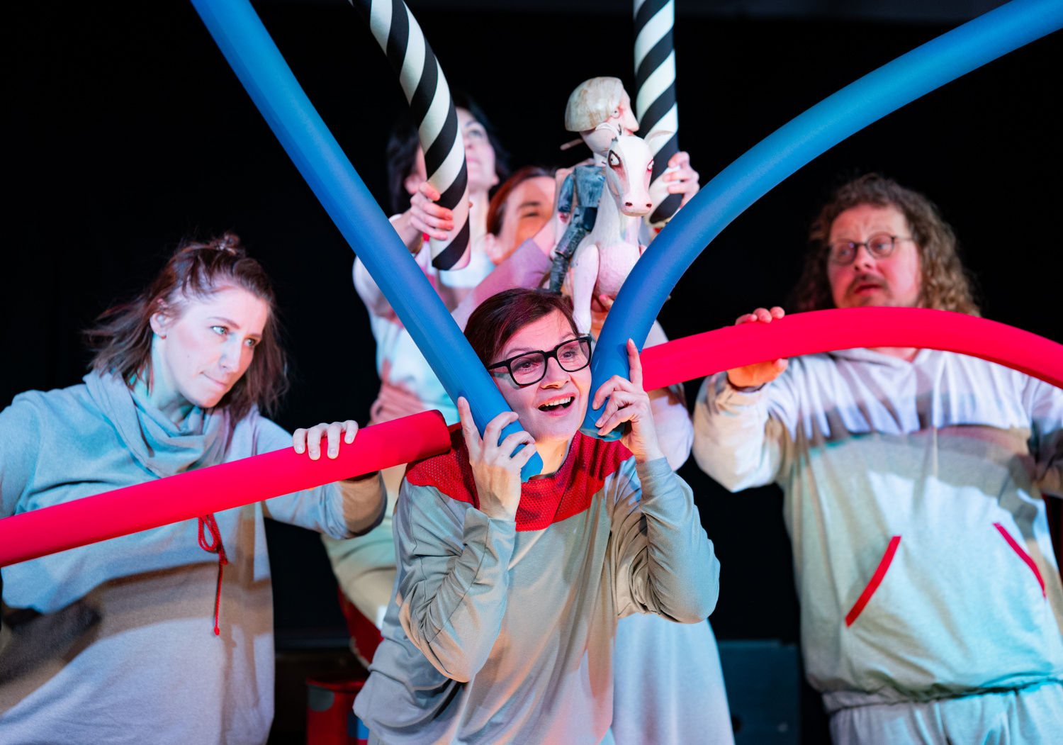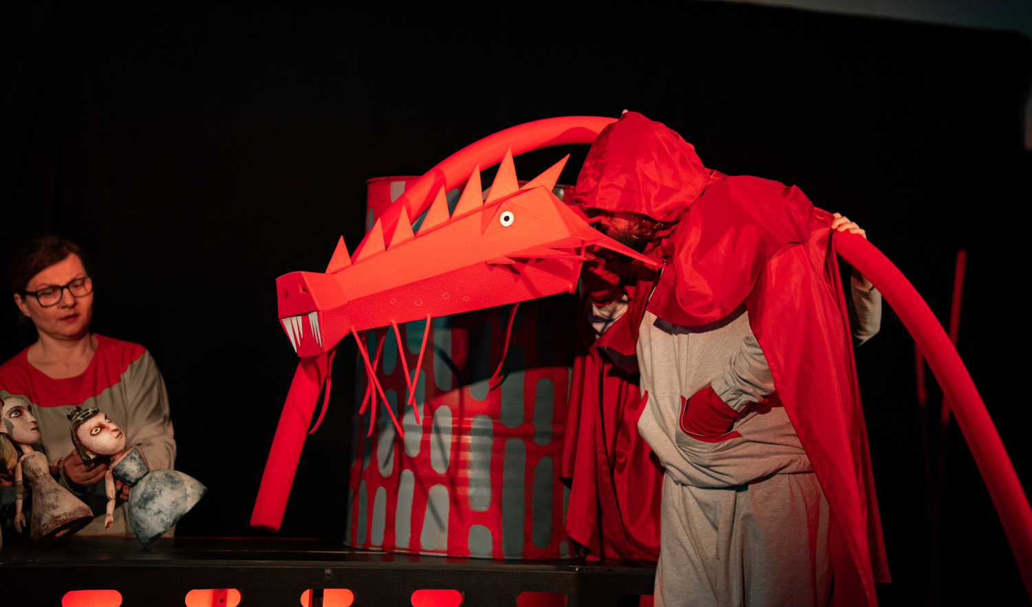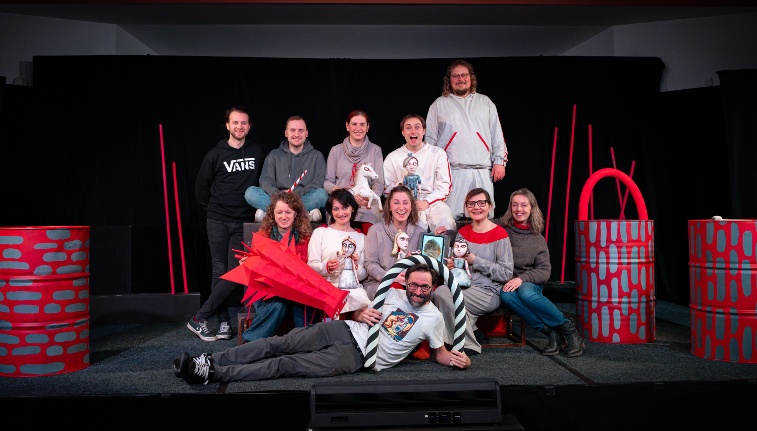 Na scéně, jejíž autorkou je Bára Čechová, dominuje červená a šedá barva. Nevyhýbá se kostýmům ani rekvizitám v podobě plechových sudů a pěnových tyčí. Pokud vás zarazil výběr právě těchto nesourodých předmětů, věřte, že jejich využití je přesně tím, co činí tuto pohádku velmi originální a pro dětskou pozornost magneticky přitažlivou.