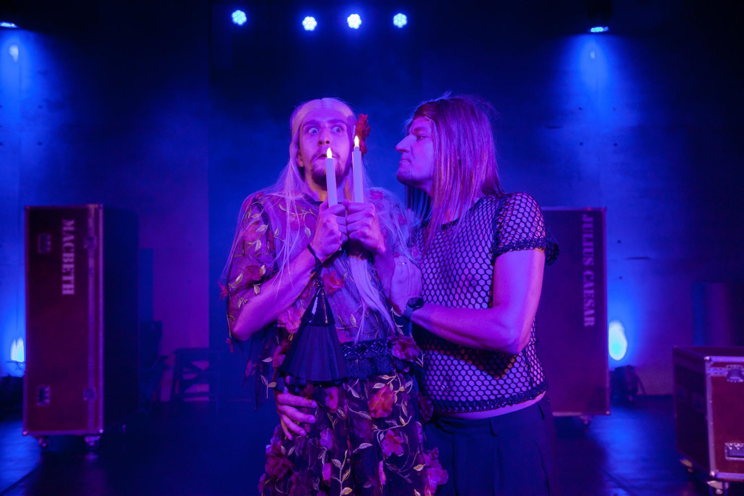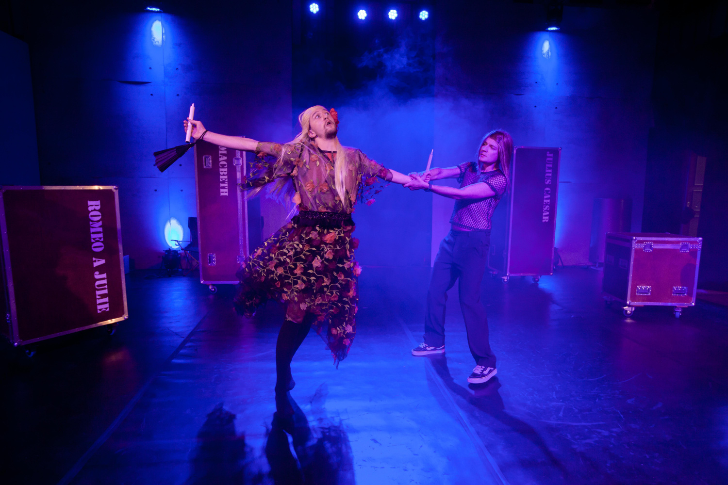 Rovněž scénografie Jaroslava Milfajta respektovala alžbětinskou tradici a jednotlivé uspořádání výstupů bylo tvořeno pomocí beden s názvy nejznámějších titulů, jako Mackbeth, Hamlet, či Romeo a Julie. Velký kus práce odvedly kostymérky, které sice ze zákulisí, ale umožnily, že představení plynulo v nastaveném tempu, když pomáhaly hercům měnit kostýmy Tomáše Kypty mnohdy v rámci vteřin. V některých situacích se objevovaly také loutky, které vyrobil Pavel Skorkovský a oblékla Ivana Kolondrová. Autorem hudebních doprovodů byl Karel Albrecht, který zapracoval do realizace rapp, instrumentální hudbu i operu.