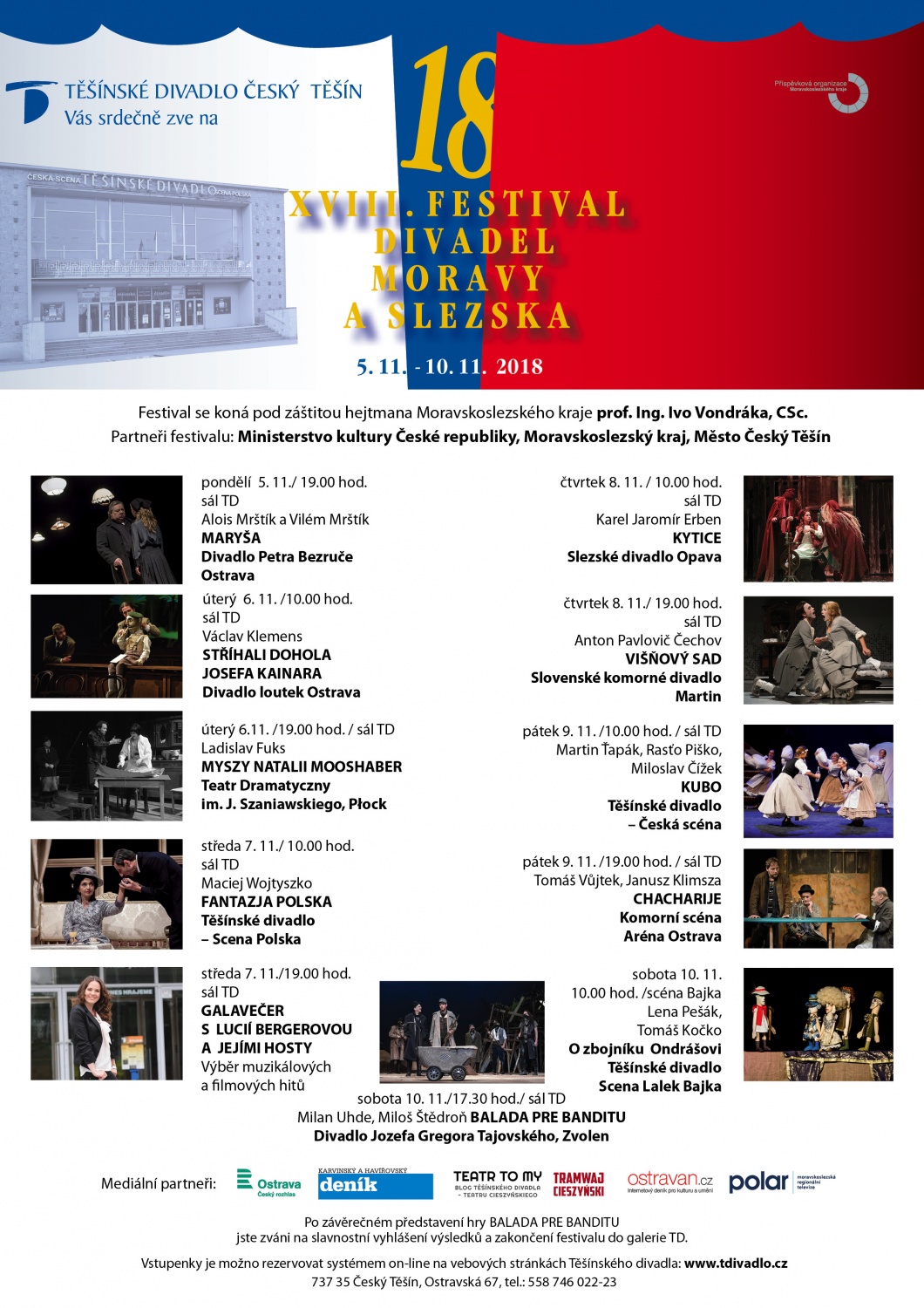 Ve dnech 5. až 10. listopadu se v Těšínském divadle v Českém Těšíně uskuteční osmnáctý ročník Festivalu divadel Moravy a Slezska. Pohled do festivalového programu napovídá, že zúčastněná divadla se budou prezentovat dramaturgickými závažnými a žánrově pestrými inscenacemi.
