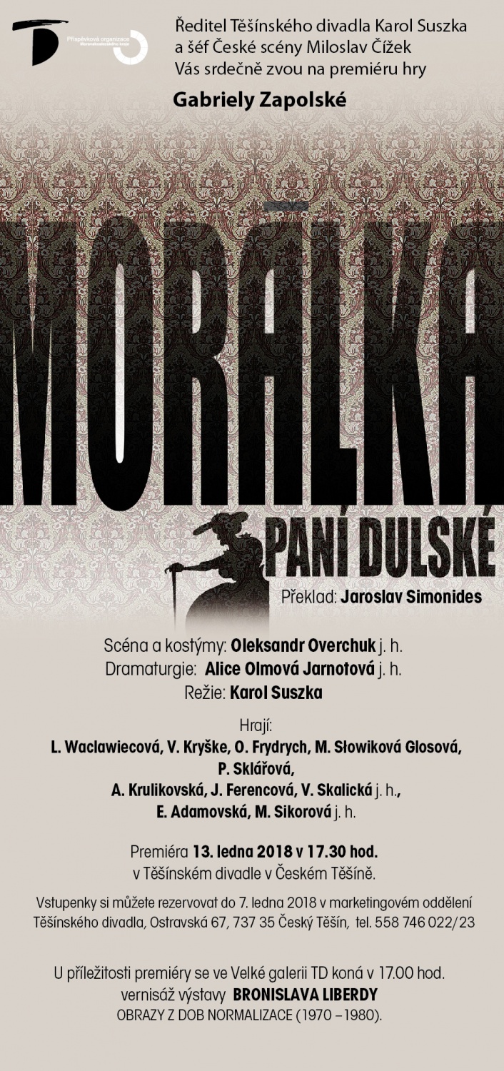 Ředitel Těšínského divadla Karol Suszka a šéf České scény Miloslav Čížek Vás srdečně zvou na premiéru hry Gabriely Zapolské "MORÁLKA PANÍ DULSKÉ" v sobotu 13. ledna 2018 v 17.30 hod. Před představením v 17.00 hod. se ve Velké galerii Těšínského divadla uskuteční vernisáž výstavy Bronislava Liberdy "Obrazy z dob normalizace (1970 - 1980)". Srdečně zveme.