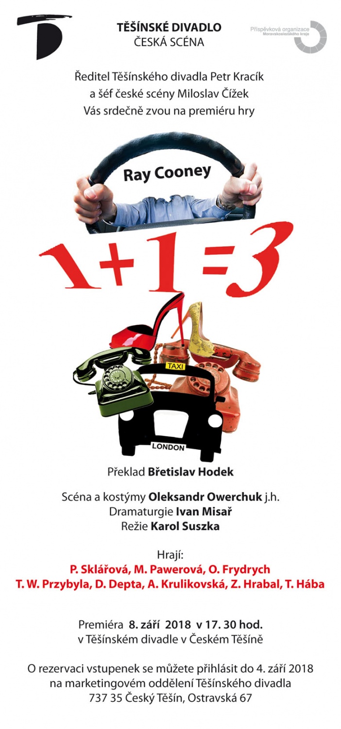Ředitel Těšínského divadla Petr Kracik a šéf České scény Vás srdečně zvou na první premiéru v divadelní sezóně 2018/2019, kterou bude hra 1+1=3 v režii Karla Suszky.